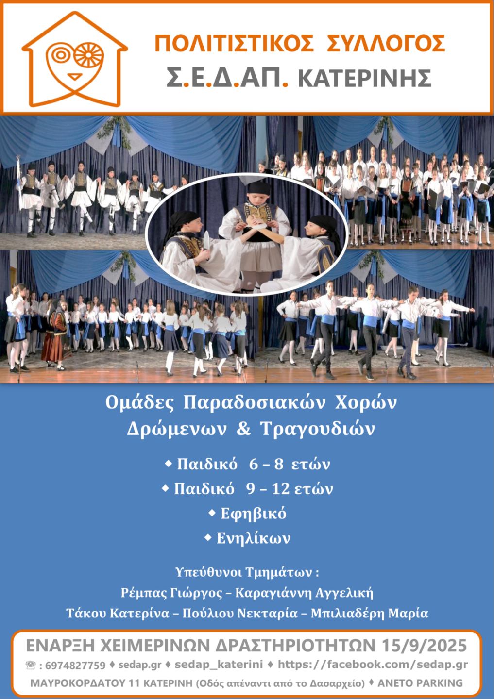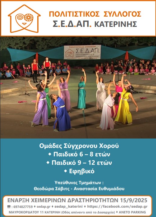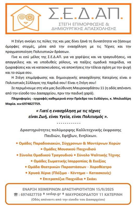 Από 8/9/2025 και κάθε απόγευμα 6.30-8.00 θα μας βρείτε στην νέα μας διεύθυνση στην οδό Μαυροκορδάτου 11. Για πληροφορίες κι εγγραφές μπορείτε να καλείτε στο τηλ. 6974827759 κα. Μπιλιαδέρη Μαρία.