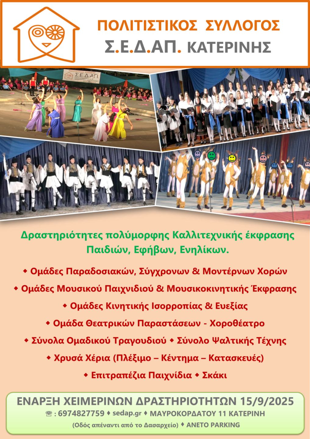 Από 8/9/2025 και κάθε απόγευμα 6.30-8.00 θα μας βρείτε στην νέα μας διεύθυνση στην οδό Μαυροκορδάτου 11. Για πληροφορίες κι εγγραφές μπορείτε να καλείτε στο τηλ. 6974827759 κα. Μπιλιαδέρη Μαρία.